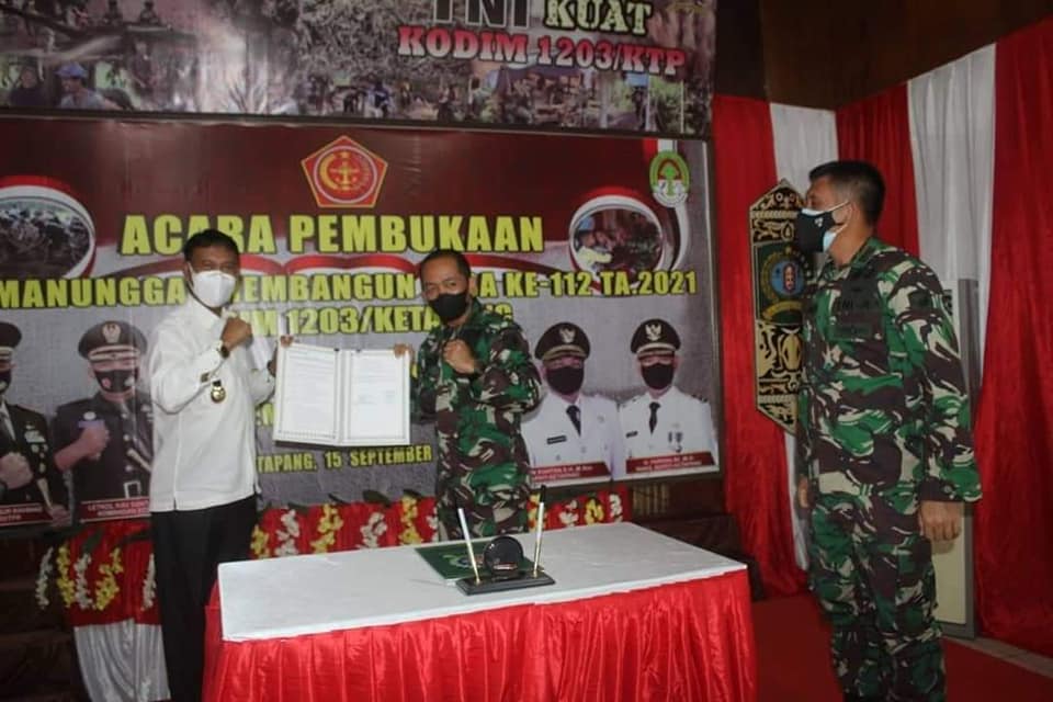 Ketapang – Danrem 121/Abw Brigjen TNI Dr. Ronny, S.A.P,. M. M, diwakili oleh Kasiter Korem 121/Abw Kolonel Inf Daniel Edgar Syaloom Lalawi, menghadiri Acara pembukaan program TNI Manunggal Membangun Desa (TMMD) Reguler Ke-112 TA. 2021 yang berlangsung di Aula Makodim 1203/Ktp Jl. Letjend S. Parman, Kec. Delta Pawan, Kab.Ketapang, Rabu (15/9/2021).