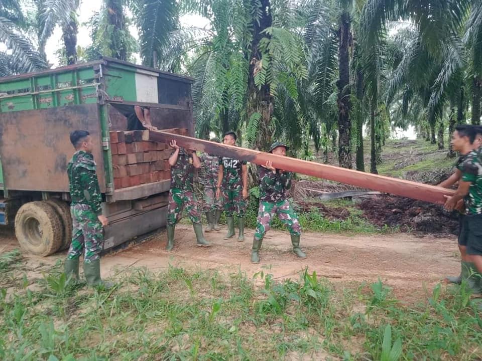 Sintang – Terkendala medan yang hancur dan licin, tak membuat anggota Satgas TMMD Kodim Sintang patah semangat untuk mengangkut kayu ke lokasi sasaran pekerjaan jembatan di Desa Simba Raya, Sabtu (18/09/2021).