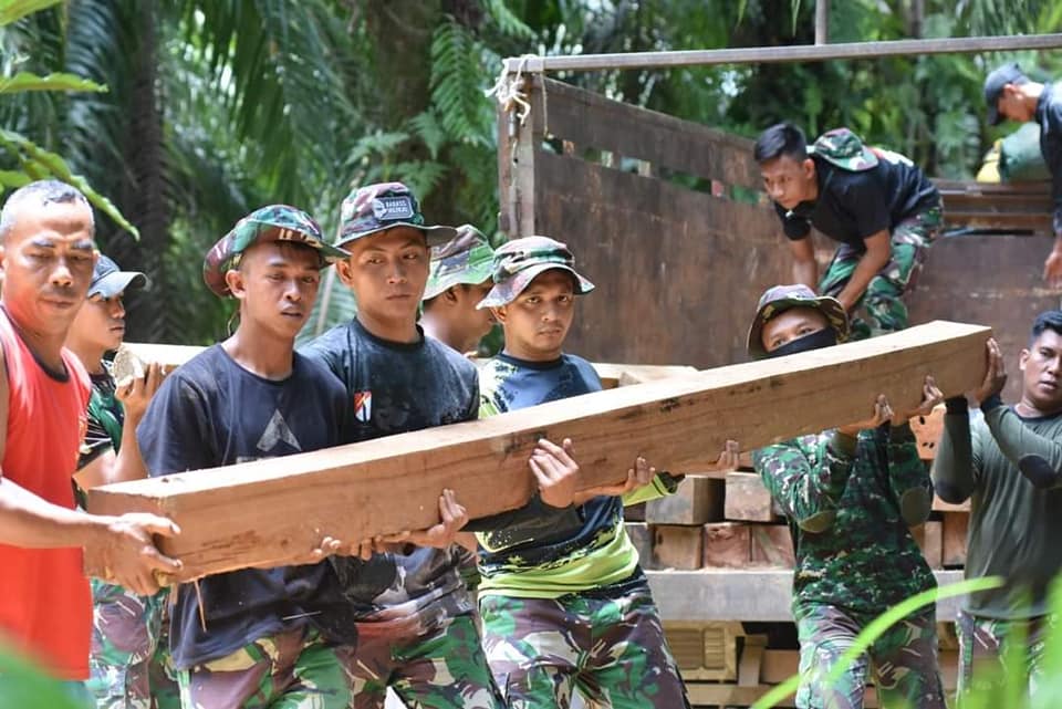 Dengan semangat anggota Satgas TMMD mengangkat kayu yang berukuran 15 x 15 cm dengan panjang 4 meter ini.