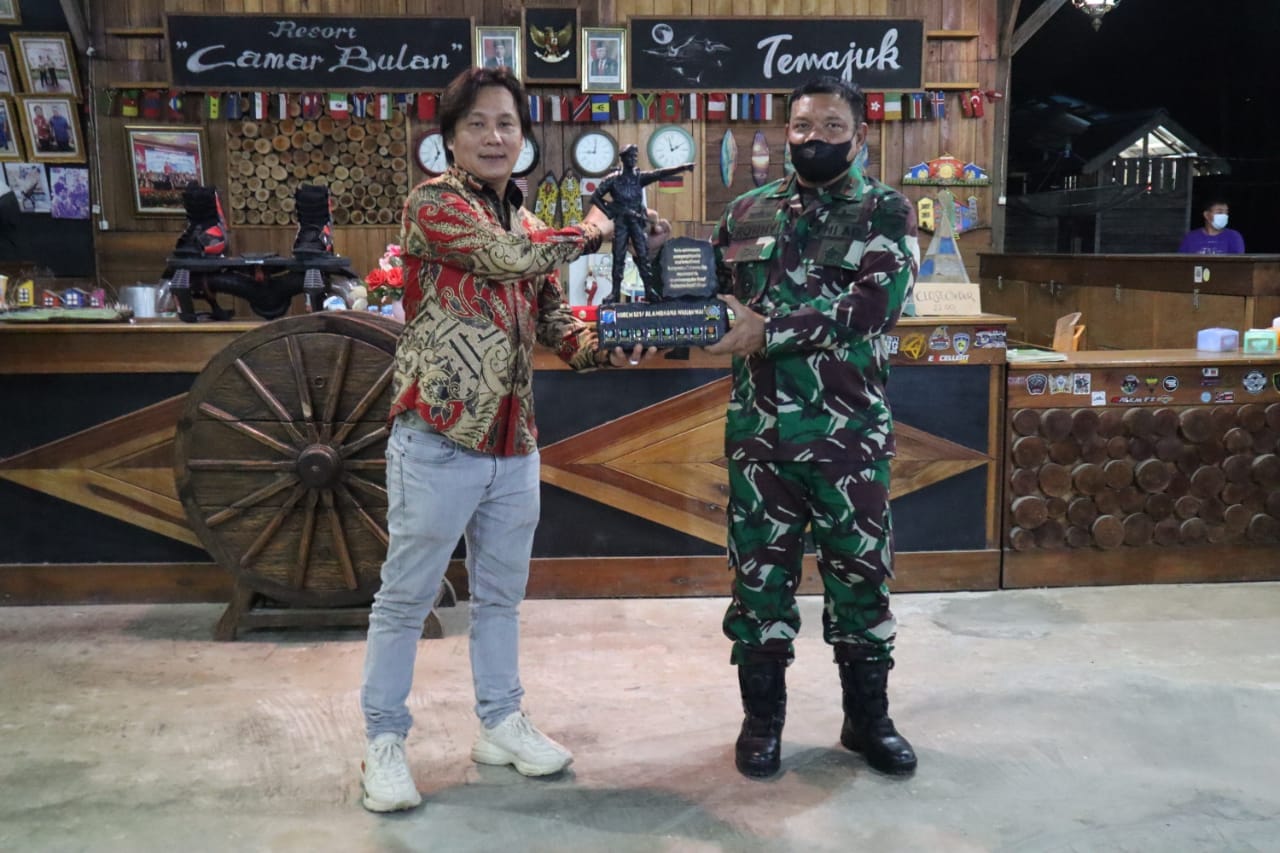 Apresiasi Danrem 121/Abw adanya vila terbalik di dusun Camar Bulan Desa Temajuk ditandai dengan pemberian plakat kepada pemilik vila yaitu bapak Keven Sukirno.