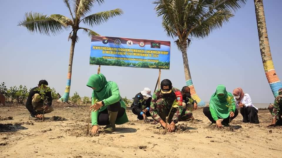 MEMPAWAH – Kodim 1201/Mempawah melakukan penanaman bibit mangrove di lokasi wisata Pantai Tanjung Burung yang terletak di Kelurahan Tanjung, Kecamatan Mempawah Hilir, Kabupaten Mempawah, Rabu (22/9/2021).
