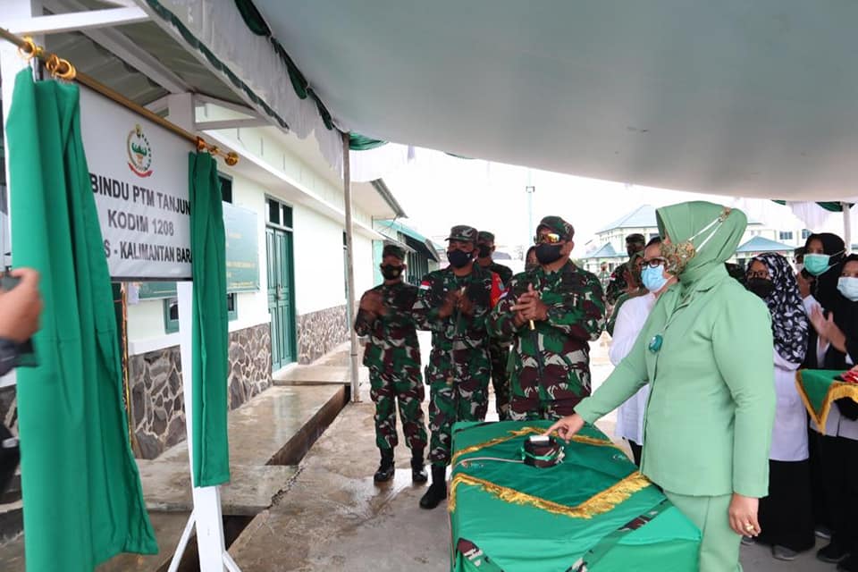 Sambas, Ketua Persit KCK Koorcab Rem 121 PD XII/TPR Ibu Rissa Ronny yang di dampingi Danrem 121/Abw Brigjen TNI Dr. Ronny, S.A.P., M.M, meresmikan Posbindu (Pos Binaan Terpadu) PTM Tanjung Kodim 1208/Sambas di desa Lumbang kecamatan Sambas kabupaten Sambas. Rabu, (22/09/2021).