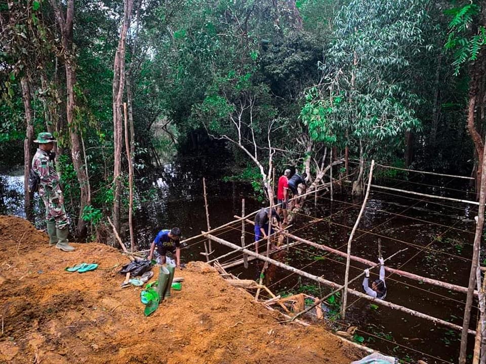 Sintang – Pasiter Kodim 1205/Sintang, Kapten Inf H. Didik terus mengawasi proses penancapan tiang jembatan di lokasi TMMD 112 desa Ampar Bedang, kecamatan Binjai Hulu, Sintang, Kamis (23/09/2021).