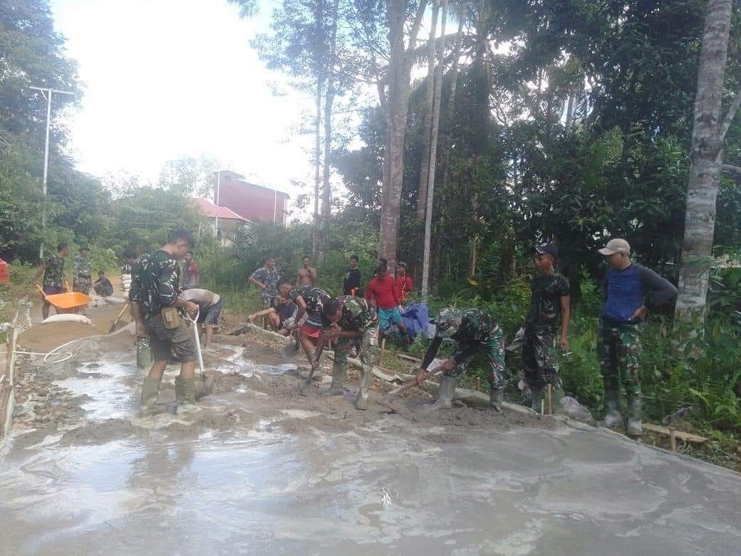 Ketapang – Satgas TMMD Reguler Ke-112 Kodim 1203/Ktp bersama warga gas pol pengerjaan dalam penggarapan jalan rabat beton di Desa Riam Bunut Kecamatan Sungai Laur, Kabupaten Ketapang, Kamis (23/9/2021)