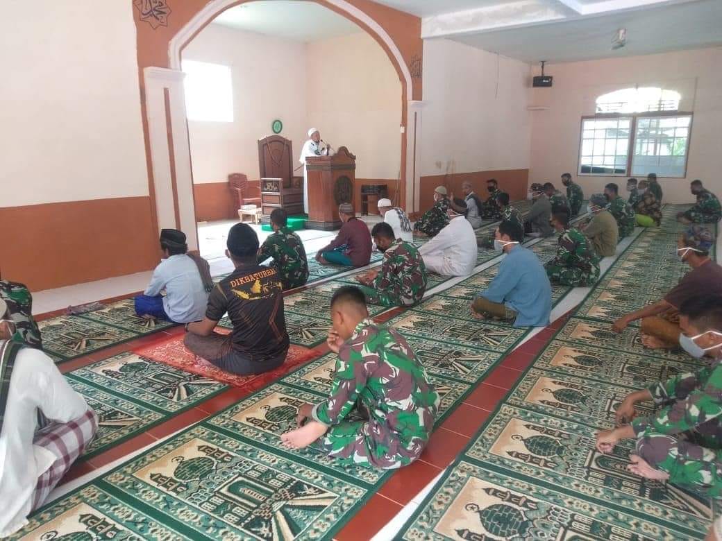 Pekerjaan dan rasa lelah di siang hari tak menyurutkan personil satgas TMMD untuk mengikuti ibadah sholat jumat berjamaah di Masjid Al-Hidayah, Desa Riam Bunut, Kecamatan Sei Laur, Kabupaten Ketapang, Jum’at (24/9/2021)