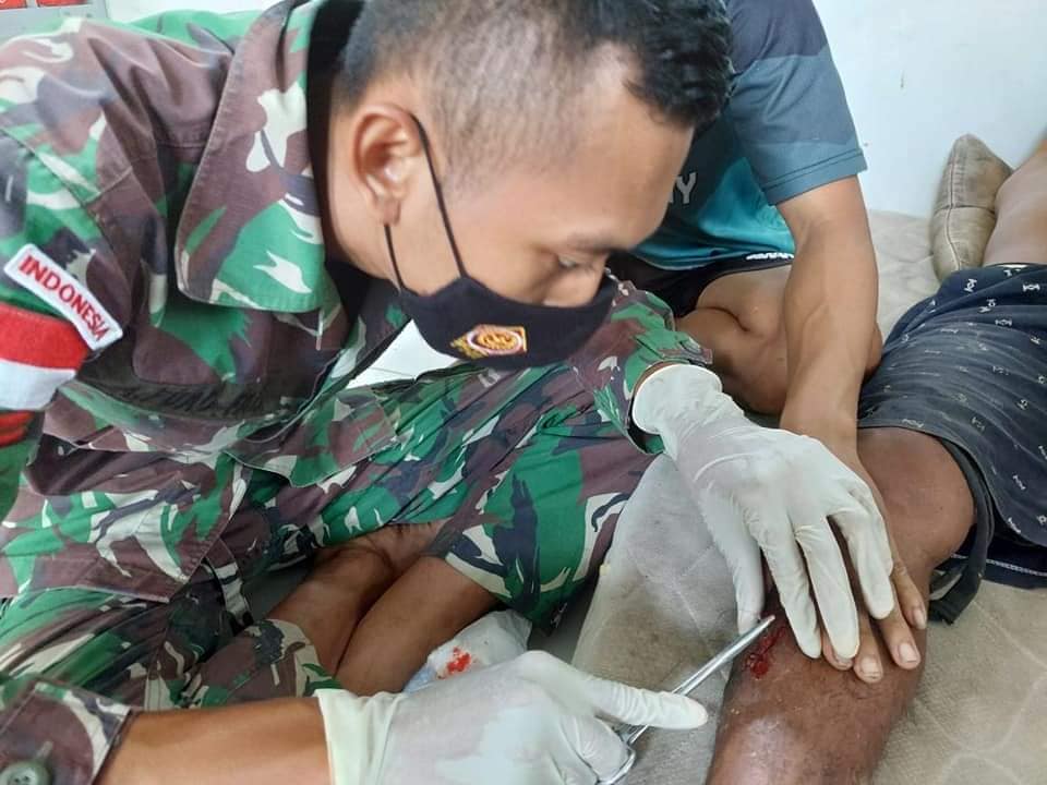Pratu Ahmad dan dua rekannya,dengan sigap membantu warga mulai dari membersihkan luka,menjahit yang luka sebanyak lima jahitan dan pemberian obat sehingga tidak menyebabkan infeksi,Luka Robek umumnya di sebabkan benda tajam, seperti pisau,pecahan kaca dan kayu.penyebab lain dari itu benturan keras dan benda tumpul, kegiatan ini berjalan dengan lancar serta tetap mematuhi protokol kesehatan.(Pen Yonif 144/JY).