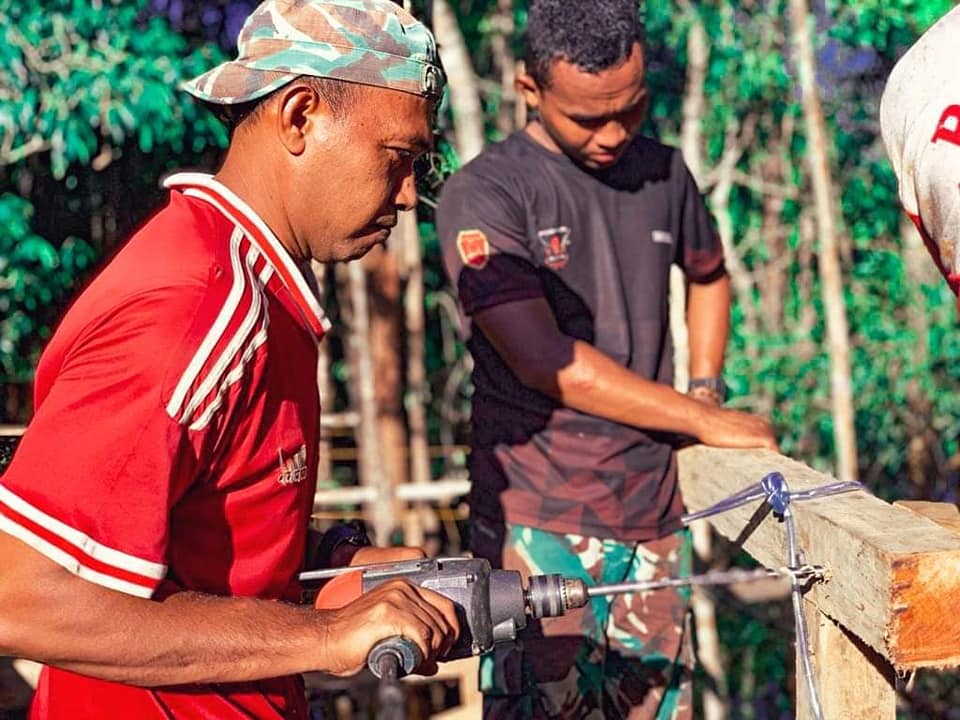 Serda Haryono, anggota Satgas mengatakan, sampai dengan hari ini kami maaih mengerjakan tiang dan galar jembatan, jika itu sudah terpasang maka tinggal pasang papan aja.