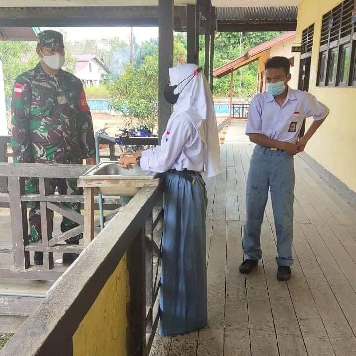 Kapuas Hulu – Koramil 1206-09/Jongkong Pelda Didik Riyono melaksanakan himbauan dan sosialisasi penerapan protokol kesehatan di lingkungan sekolah menengah atas negeri 1 pengkadan, Juga melaksanakan pengecekan suhu tubuh, demo gemar mencuci tangan, Membagikan masker di SMA 1 Negeri kecamatan pengkadan kabupaten Kapuas hulu Kalimantan barat. Senin, (27/09/2021).