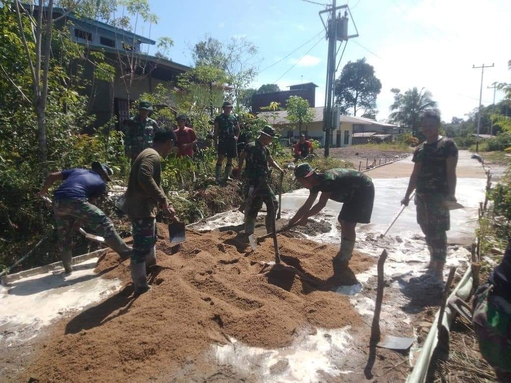 Ketapang – Demi mengejar target, personil Satgas TNI Manunggal Membangun Desa (TMMD) Reguler Ke-112 Kodim 1203/Ktp bersama masyarakat bekerja exstra di Desa Riam Bunut, Kecamatan Sungai Laur, Kabupaten Ketapang yang menjadi lokasi sasaraan TMMD. Minggu (26/9/2021)
