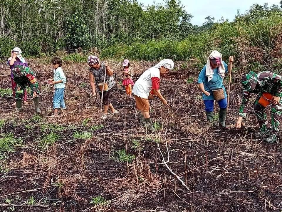 Letda inf Ridha F bersama tiga rekannya saling bekerjasama dengan warga mulai dari menancapkan tongkat kayu yang di runcingkan ke tanah,dan memasukan benih padi ke dalam lobang tanah bersama warga Dayak, harapan kita panen kedepan nya lebih melimpah sehingga dapat padi yang banyak”, imbuhnya.