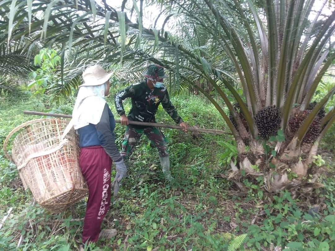 Hal ini seperti yang dilakukan Pratu Heri Susanto, sembari pulang dari lokasi sasaran fisik TMMD, Ia melihat salah satu warga Desa Riam Bunut, Kecamatan Sungai Laur yang sedang memanen buah sawit miliknya.