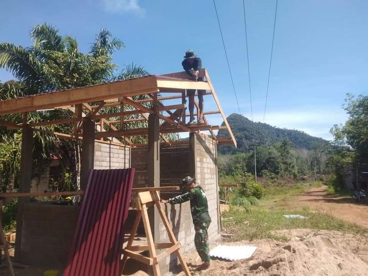 Walaupun kemarin sore sedikit terkendala karena cuaca hujan Satgas TMMD bersama masyarakat hari ini merampungkan pemasangan atap seng Pembangunan Pos Kamling,