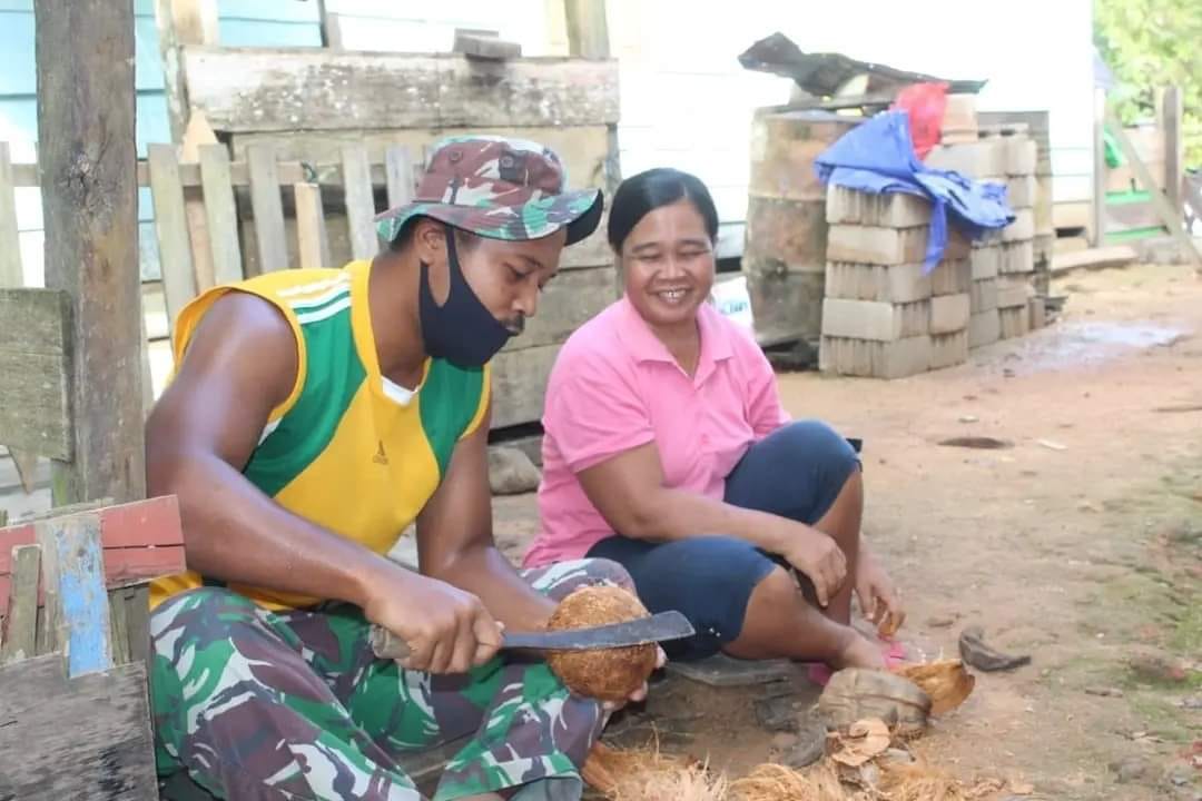 Salah satu personel satgas TMMD, Praka Amin Susanto pun terlihat menyempatkan diri untuk singgah ke rumah salah satu warga sembari berjalan pulang usai melaksanakan tugas dan tanggung jawabnya bekerja di sasaran fisik TMMD. Kedatangannya pun disambut hangat oleh Ibu Eselon sang pemlik rumah. Rabu (29/9/2021)