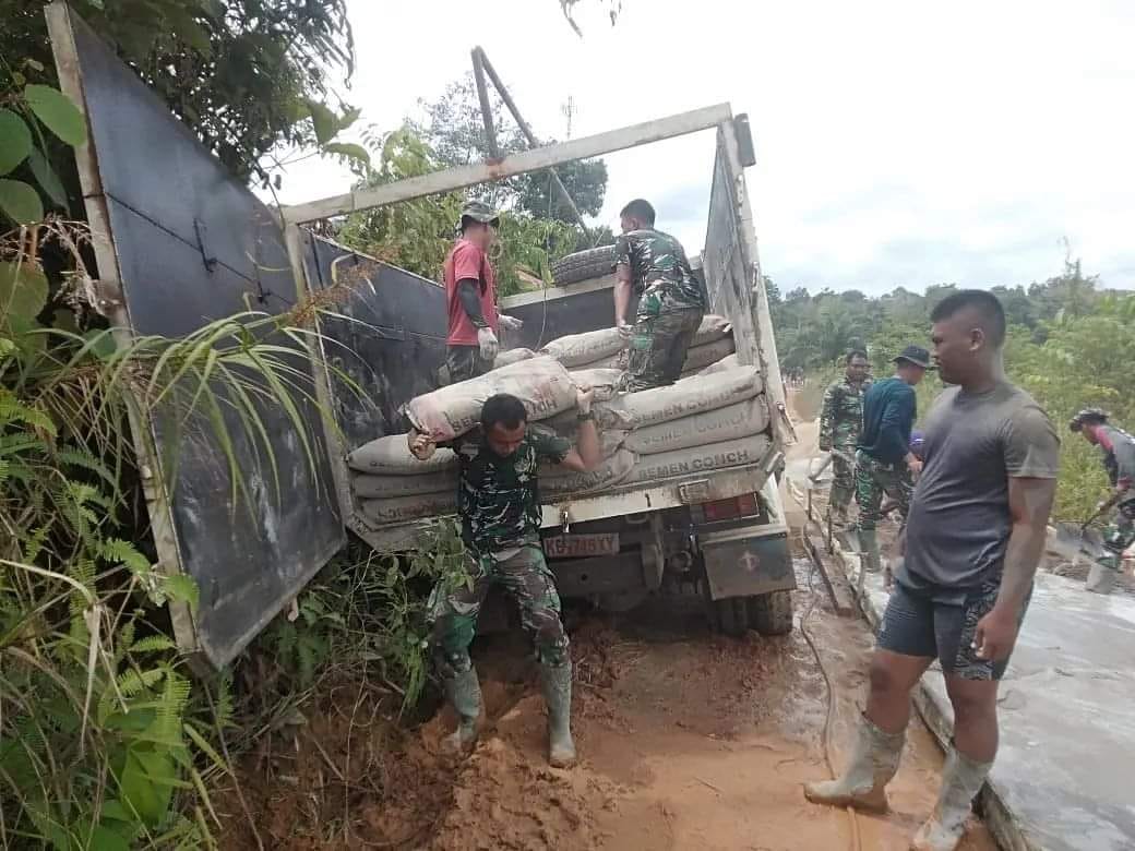 Serka Kuswantoro selaku koordinator lapangan membenarkan hal tersebut, pasalnya material tersebut didatangkan dari Kota ketapang dengan menggunakan Truck Kodim, dengan perjalanan memakan waktu sekitar 6-7 jam, yang kemudian dilangsir sebagian dengan menggunakan mobil pick-up dan ada pula yang bisa langsung kesasaran,”ungkapnya.
