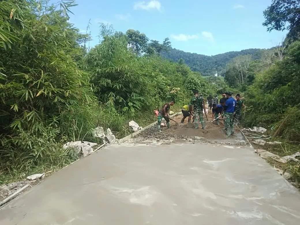 Pemandangan seperti ini terlihat di lokasi pembangunan jalan rabat beton yang merupakan salah satu sasaran fisik kegiatan TMMD kali ini.