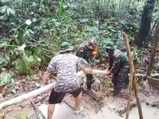 Langau 1,- Anggota Satgas Pam Tas RI-Malaysia Yonif 144/JY membantu warga perbaiki Pipa Air yang Bocor di desa Langau Kecamatan Puring Kencana Kabupaten Kapuas Hulu Kalbar.