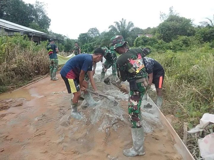 Contohnya seperti yang terlihat saat ini Praka Ferly Ferdiyanto dan rekan-rekanya bersama warga sibuk meracik adonan semen dan pasir dengan kompak dan semangat, di Desa Riam Bunut Kec. Sungai Laur Kab. Ketapang, Sabtu (2/10/2021).