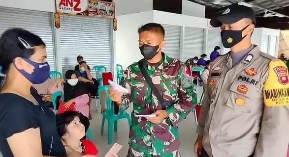 Serda Toni Indriyono beserta tiga rekannya saling bekerjasama dalam membagikan masker dan membantu kegiatan gebyar Vaksinasi Covid-19 mulai dari tensi dan pendataan serta pemeriksaan kesehatan.