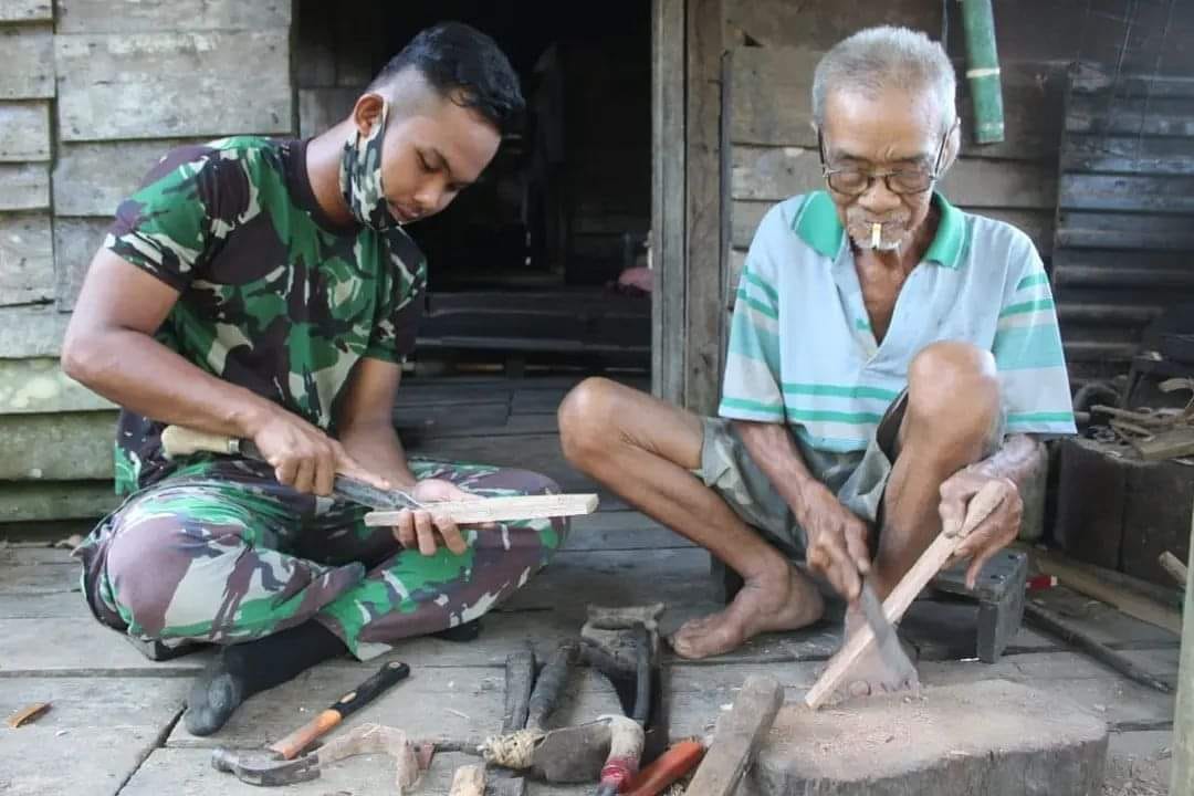Seperti yang dilakukan Pratu Helmi Yahya, setelah melaksanakan pengerjaan di sasaran fisik di sore hari menyempatkan mampir ke rumah kakek Musa warga desa Riam Bunut yang sedang asik meraut kayu untuk dijadikan gagang dan sarung golok.