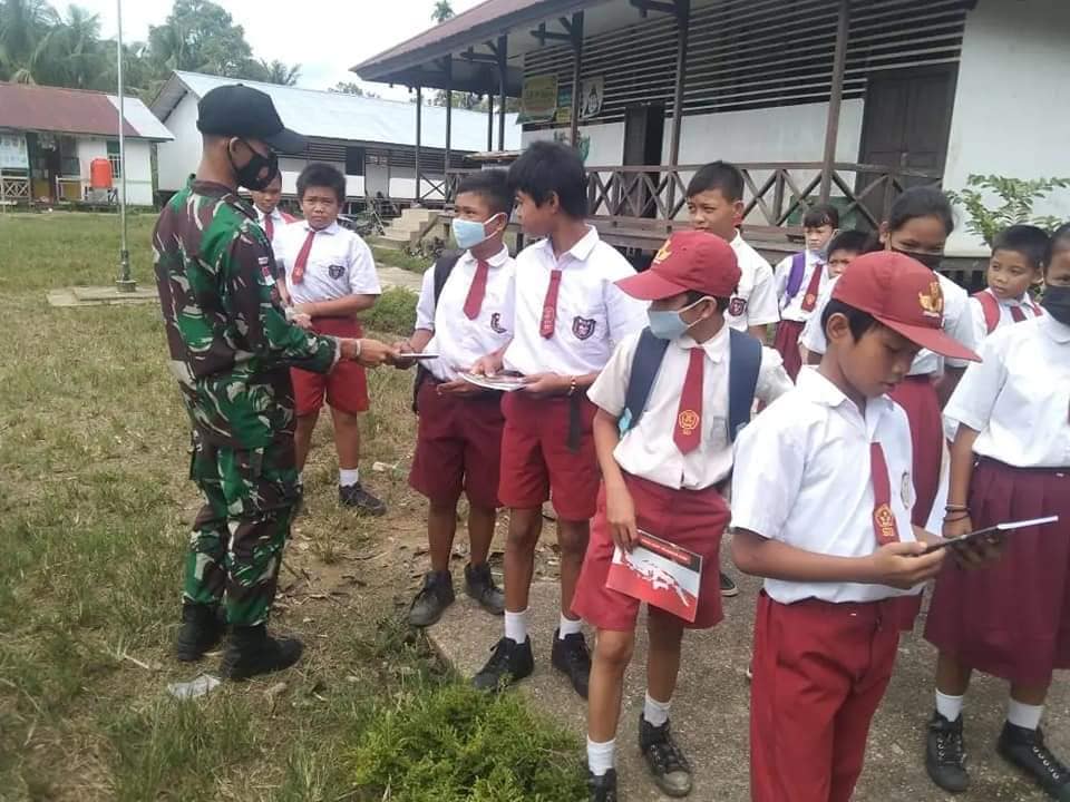 Bakul,- Anggota Satgas Pam Tas RI-Malaysia Yonif 144/JY berikan bantuan sargal Tas dan buku ke sekolah SDN 1 desa Bakul Kecamatan Batang Lupar Kabupaten Kapuas Hulu Kalbar.