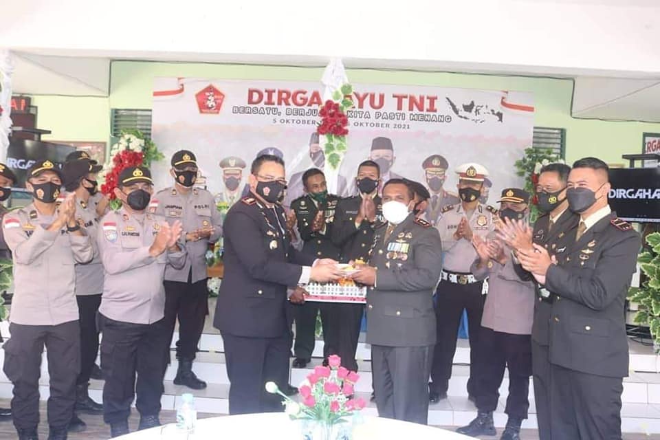 Kapuas Hulu – Dandim 1206/PSB Letkol Inf Jemi Oktis Oil S.I.P bersama Forum Koordinasi Pimpinan Daerah (Forkopimda) Kabupaten Kapuas Hulu mengikuti upacara peringatan Hari Ulang Tahun ke-76 Tentara Nasional Indonesia secara virtual bertempat di Makodim 1206/PSB Jln. Piere Tendean, Kelurahan Kota, Kecamatan Putussibau Utara Kabupaten Kapuas Hulu. Selasa, (05/10/2021).