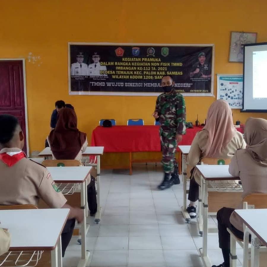 Sambas,- Personil Satgas TMMD Imbangan kodim 1208/Sbs, Sertu Riyono selain melaksanakan Fisik juga melaksanakan Non Fisik salah satunya melaksanakan pelatihan teori kepada Pramuka Saka Wira dan pengenalan Outbound yang bertempat di SMAN 02 Temajuk Ds. Temajuk Kec. Paloh Kab. Sambas. Selasa (05/10/21)