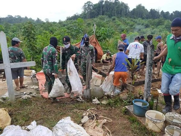 Langau 1,-Anggota Satgas Pamtas RI-Malaysia Yonif 144/JY membantu Pengecoran Makam Warga di desa Langau Kecamatan Puring Kencana Kabupaten Kapuas Hulu Kalbar.