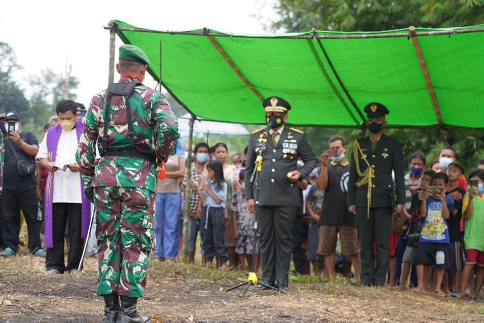 Sanggau – Danrem 121/Abw Brigjen TNI Dr.Ronny,S.A.P., M.M bertindak sebagai Inspektur Upacara pada pemakaman secara militer terhadap almarhum Prada Petrus Jaka di TPU.Sei Ubah Desa Serambi, Jaya Kec.Mukok Kab. Sanggau Kalimantan Barat, Kamis (14/10/2021)