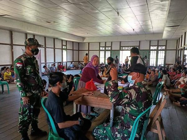 Dalam gebyar Vaksinasi Covid-19 untuk percepatan penanganan Vaksinasi anggota satgas kami membantu tenaga medis Puskesmas melaksanakan Vaksinasi, kegiatan ini merupakan program pemerintah yang harus kita dukung dan dilaksanakan meskipun di daerah perbatasan.
