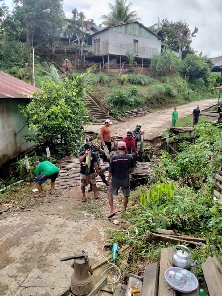 Sintang – Babinsa Koramil 1205 – 15/Sokan, Sertu Hasibuan bersama masyarakat melaksanakan kegiatan perbaikan jembatan kayu yang sudah rusak di Desa Ng Potai, Kecamatan Sokan, Kabupaten Melawi, Rabu (20/10/2021).