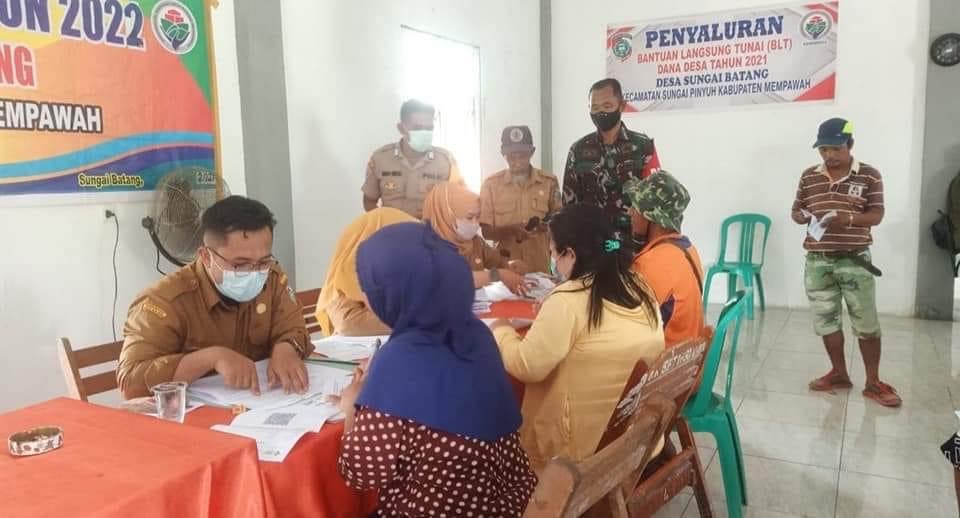 Mempawah – Desa Sungai Batang, Kecamatan Sungai Pinyuh, Kabupaten Mempawah menuntaskan penyaluran bantuan langsung tunai (BLT) tahap Xl untuk bulan November 2021 dari Dana Desa, untuk warga terdampak wabah Covid-19. Pembagian BLT tersebut dilaksanakan di Balai Desa Sungai Batang, Selasa (2/11/2021).