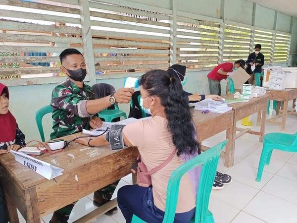 Dalam mencegah penyebaran Covid-19 anggota Satgas pos Muakan Petinggi bersama tenaga medis Puskesmas melaksanakan Vaksinasi di Balai desa untuk percepatan penanganan Covid-19.