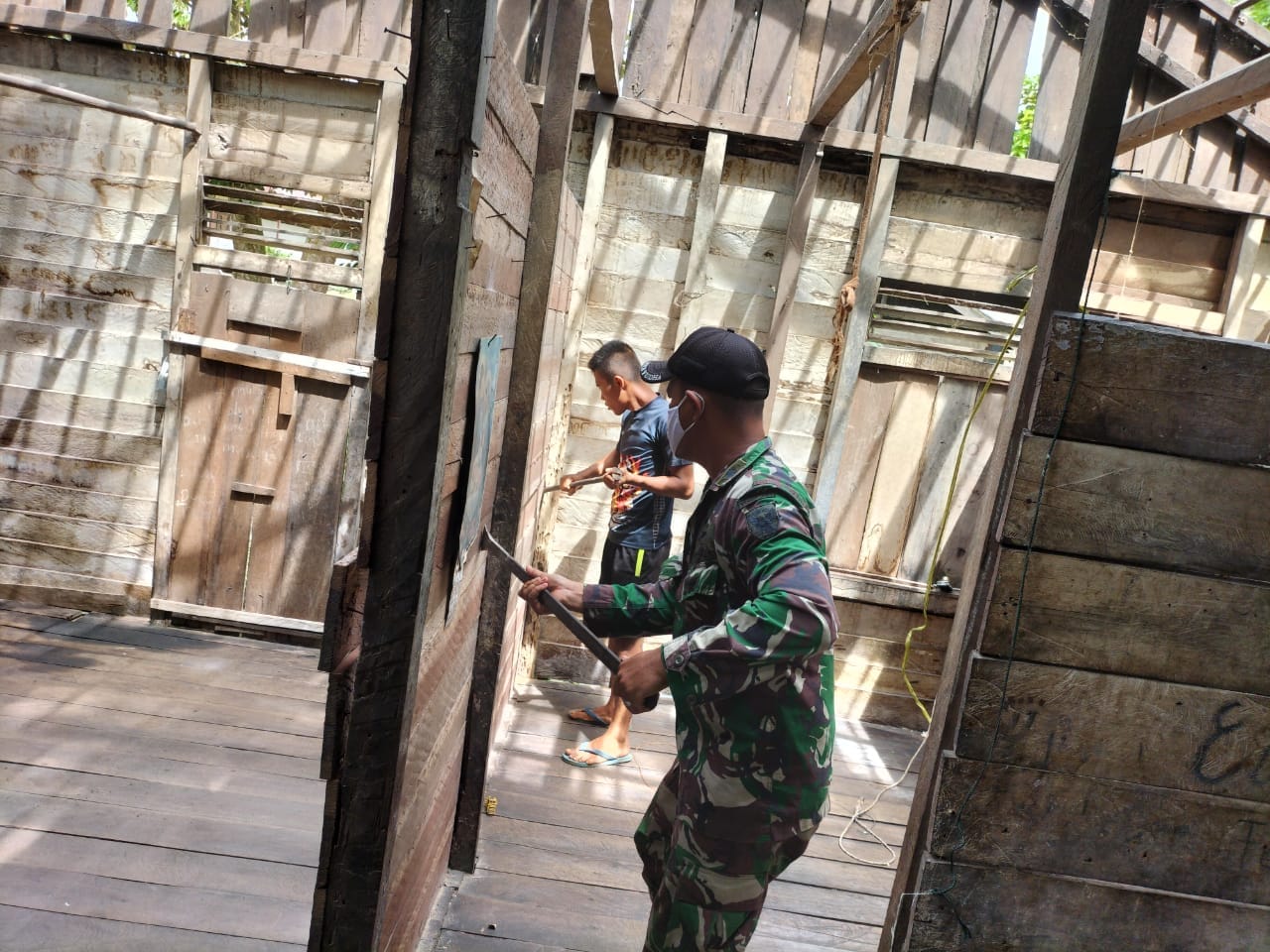 Sei badak,-Anggota Satgas Pamtas RI-Malaysia Yonif 144/JY melaksanakan Karya Bhakti bangun Rumah warga di desa Sei badak Kecamatan Ketungau Hulu Kabupaten Sintang Kalbar.