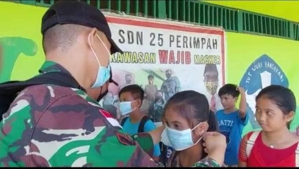 Kegiatan ini merupakan Salah satu upaya untuk menekan jumlah penyebaran Covid-19 termasuk anak-anak pada sekolah tingkat rendah, diharapkan masker yang kita sudah bagikan bisa di gunakan baik belajar dalam ruangan maupun diluar ruangan”, ucapannya.