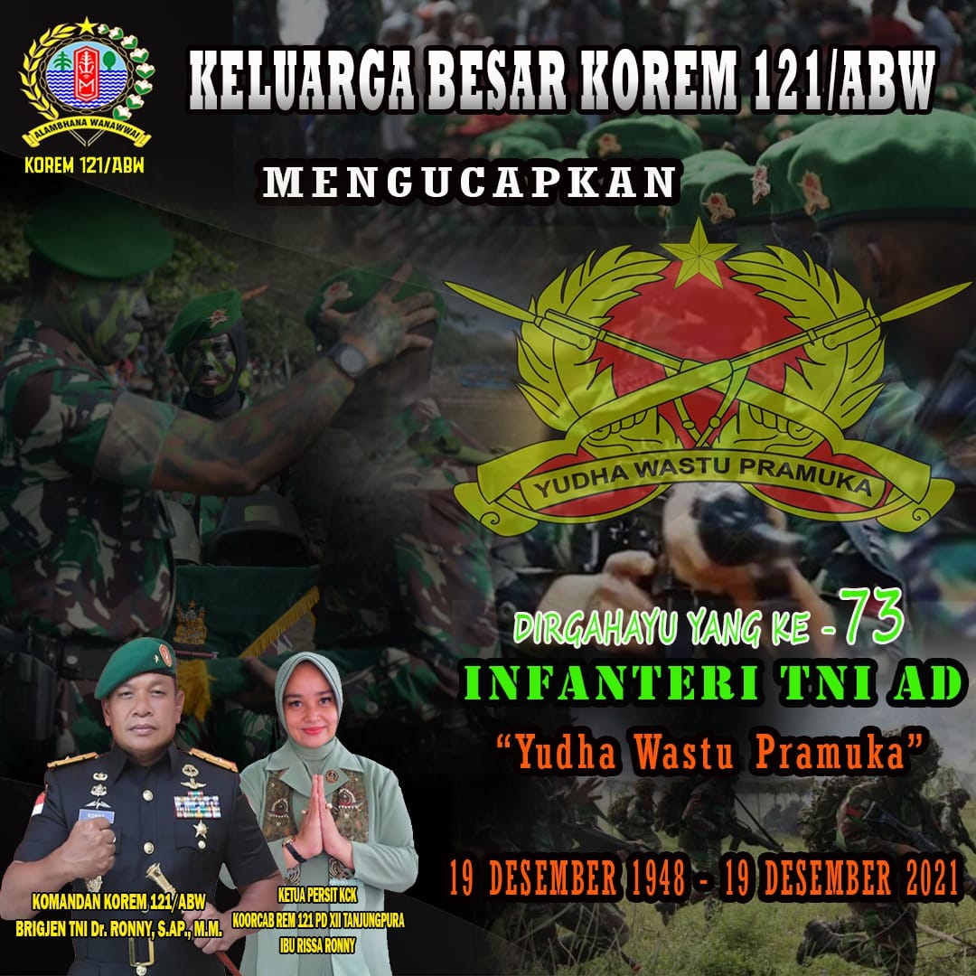 KELUARGA BESAR KOREM 121/ABW MENGUCAPKAN DIRGAHAYU KE – 73 INFANTERI TNI AD “YUDHA WASTU PRAMUKA” 19 Desember 2021 oleh Redaksi Korem 121/abw