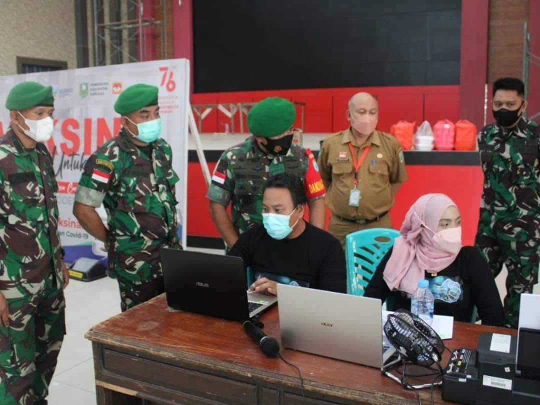 Sanggau – Komandan Kodim 1204/Sanggau Letkol Inf Bayu Yudha Pratama meninjau langsung Pelaksanaan Serbuan vaksinansi bagi masyarakat yang dilaksanakan di Gedung Balai Betemu ( GPU ) Sanggau Jln. Jend. Sudirman Kel. Beringin Kec. Kapuas Kab. Sanggau