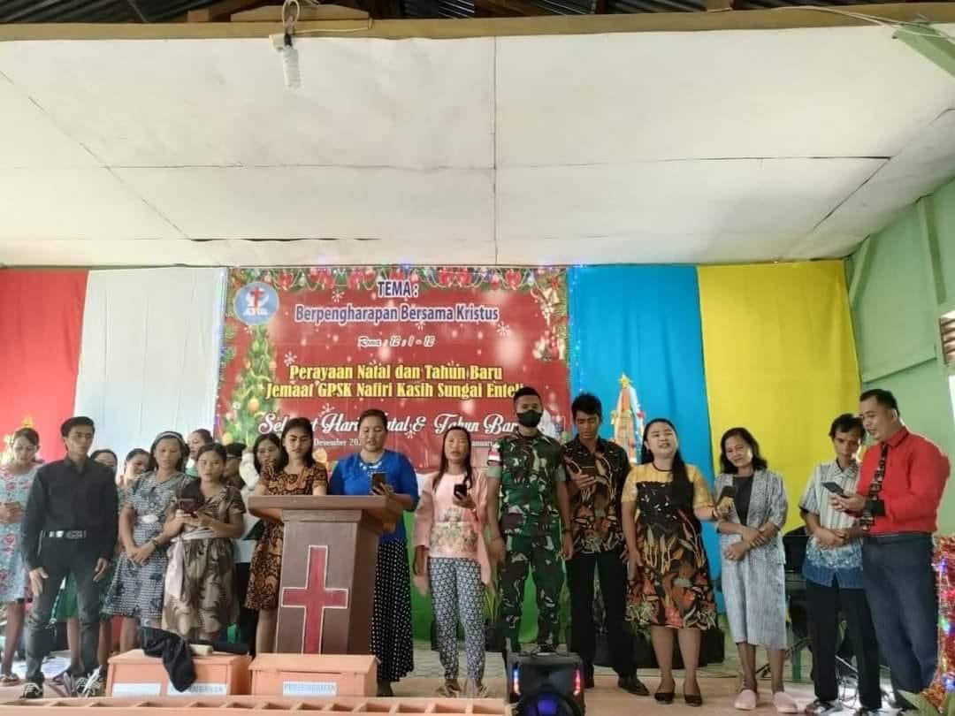 Sungai Enteli,-Anggota Satgas Pamtas RI-Malaysia Yonif 144/JY melaksanakan ibadah Natal di Gereja Nafiri bersama warga di dusun Sungai Enteli desa Neraci Jaya Kecamatan Ketungau Hulu Kabupaten Sintang Kalbar.