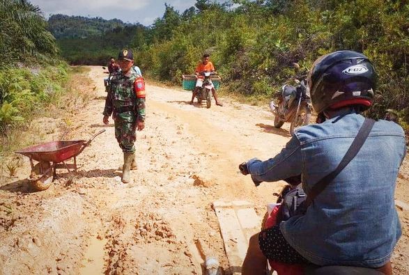 Sintang – Melaksanakan kegiatannya selaku Babinsa, memonitor desa binaan tak jarang harus melalui beberapa titik jalur jalan yang memiliki kondisi ekstrim, seperti yang dialami Serda Suparsono, Babinsa Koramil 1205-09/Ketungau Tengah saat akan menuju Desa Margahayu. Dengan peralatan seadanya, Babinsa bersama warga melakukan penimbunan jalan yang rusak akibat curah hujan, Jumat (06/08/2021).