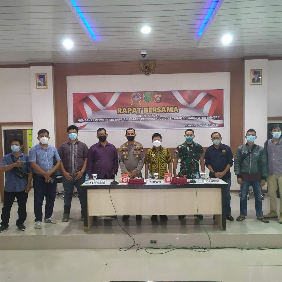 Forkopimda Adakan Rapat Koordinasi Percepatan Penanganan Covid-19 Di Wilayah Kab. Sambas Sambas – Bertempat di Aula Dhira Wijaya MaPolres Sambas, Jalan Kartiasa, Desa Lorong, Kec. Sambas, Kab. Sambas, Komandan Kodim 1208/Sambas Letnan Kolonel Inf Dadang Armada Sari S.I.P mengikuti kegiatan Rapat Bersama dalam rangka Membahas Percepatan Capaian Target Vaksinasi Covid-19 Tahap I di Kab. Sambas, (09/01) Kegiatan tersebut dihadiri oleh, Bupati Bupati Sambas, H. Satono, S, Sos.i,MH, Dandim 1208/Sambas, Letkol Inf. Dadang Armada Sari, S.I.P Kapolres Sambas, AKBP Laba Meliala, S.I.K, Kabag Ops Polres Sambas, Kompol Raden Real Mahendra, S.H., S.I.K, Kasat Intelkam Polres Sambas, Iptu Albert Yusuf Iskandar, SH. M. Sos, Perwakilan dari pihak perusahaan Perkebunan Sawit yang ada di wilayah Kab. Sambas Kapolres Sambas AKBP Laba Meliala, S.I.K, dalam sambutannya menyampaikan, Perkebunan sawit yang ada di wilayah Sambas harapan saya tetap berjalan baik secara pengelolaan dan yang lainnya, semoga saja bisa memutar perekonomian yang ada di kab. Sambas. Terkait pembangunan tersebut adalah SDM yang ada di kab. Sambas. Pemerintah kali ini sedang menggalakkan program vaksinasi massal, upaya vaksinasi merupakan upaya untuk melindungi masyarakat dari Covid-19, Ujarnya. “Untuk mencapai vaksinasi dengan maksimal tidak bisa bergerak sendiri tanpa bantuan dari semua pihak terkait. Jika dari perusahaan memberikan bantuan untuk masyarakat yang akan vaksin dengan harapan meningkatkan animo masyarakat untuk melakukan vaksin dan pemerintah daerah akan sangat terbantu, harap Kapolres. Di kesempatan yang sama Dandim 1208/Sambas Letkol Inf Dadang Armada Sari SIP menambahkan, “Pencapaian Vaksinasi yang sudah dilaksanakan oleh pemerintah daerah Kab. Sambas merupakan peran aktif dari semua pihak, diharapkan pelaku usaha yang ada saat ini merupakan salah satu bagian penting dalam pencapaian vaksinasi tersebut, Ucapnya. “Salah satu dampak target vaksinasi tidak tercapai maka aktivitas yang ada dilapangan akan terkendala. Pencapaian vaksinasi harus secara bahu membahu kita kerjakan, harus membangun kerjasama yang baik dalam pencapaian target yang telah diberikan pemerintah pusat, Imbuhnya. “Harapannya para pengusaha juga ikut mensupport dalam pencapaian vaksinasi, jika vaksinasi telah tercapai maka aktivitas yang ada akan berjalan normal lagi dan roda ekonomi akan kembali berputar dengan baik. Dengan komunikasi yang baik dan bersinergi masa pandemi ini akan dapat kita lewati, Tutup Komandan anak Dua tersebut mengakhiri.