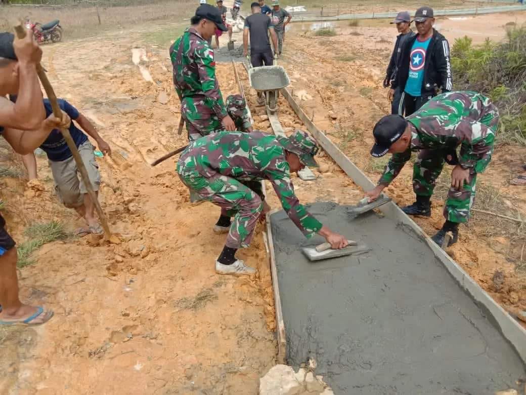Pengecoran jalan desa ini dilakukan oleh anggota Satgas bersama warga secara bergotong royong,jala desa ini merupakan akses warga untuk melintas baik ke ladang maupun aktivitas sehari-hari.