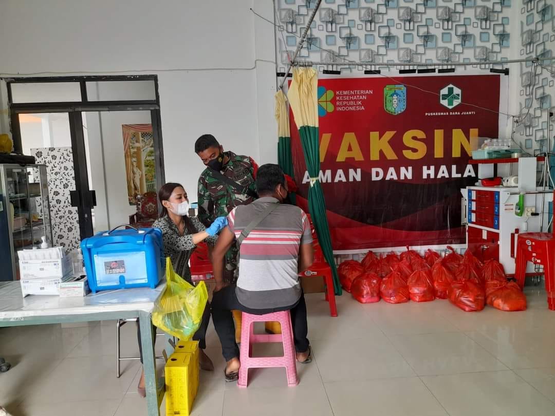 Sintang – Tenaga Kesehatan (Nakes) Puskesmas Dara Juanti, Vania Agustina ucapkan terimakasih kepada Babinsa Koramil 07/Sintang, Kopda Hendrik karena selalu memberikan pendampingan dan pengamanan Vaksinasi di Puskesmas Dara Juanti, Kelurahan Kapuas Kiri Hilir, Kecamatan Sintang, Kabupaten Sintang, Jumat (21/01/22).