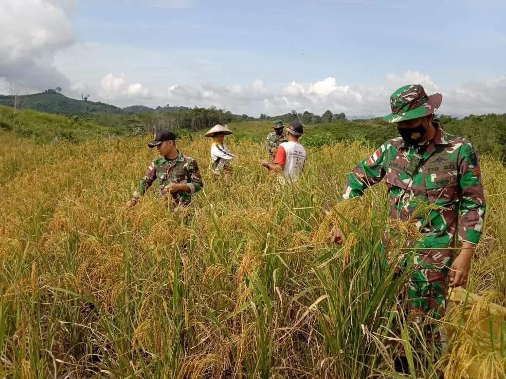 Sei Beruang,-Anggota Satgas Pamtas RI-Malaysia Yonif 144/JY dukung ketahanan pangan bantu warga Panen Padi darat bersama warga di desa Sei Beruang Kecamatan Sekayam Kabupaten Sanggau Kalbar.