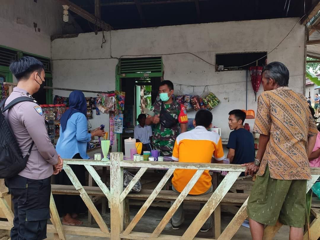 Saat itu Babinsa dan Bahabinkamtibmas pulang dari kegiatan pemantauan Vaksinasi di Desa Pemuar, ditengah perjalanan Babinsa melihat banyak warga tidak memakai masker di sebuah warung, kemudian Babinsa dan Bhambinkamtibmas tersebut datangi dan berikan himbauan agar memakai masker.