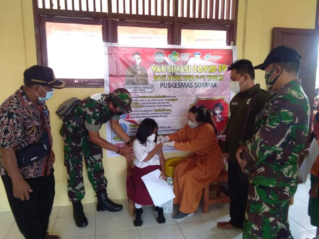 Landak – Danposramil 1201 – 07/Mempawah Hulu, Peltu Dedi bersama anggotanya Serda Simon Melaksanakan pendampingan vaksin Covid-19, kepada Siswa-Siswi SDN 03 Sompak bertempat di SDN 03 Sompak, Kabupaten Landak, Kamis (3/2/2022).