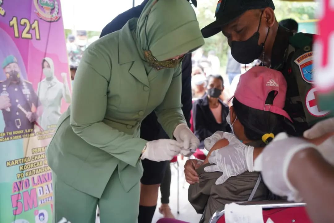 Ketua Persit KCK Koorcab Rem 121 PD XII Tanjungpura Ibu Rissa Ronny yang merupakan seorang Dokter didampingi ibu-ibu Persit lainya ini langsung turun ke lokasi pelaksanaan Vaksinasi, tidak hanya itu Ibu Rissa Ronny juga ikut memberikan suntikan Vaksin kepada masyarakat yang datang untuk di vaksin.