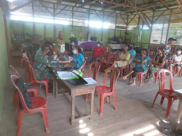 Dalam kegiatan Vaksinasi Covid-19 anggota Satgas Kami selalu bersinergi dengan Nakes Puskesmas dan Polri untuk percepatan penanganan Vaksinasi Covid-19 di perbatasan.