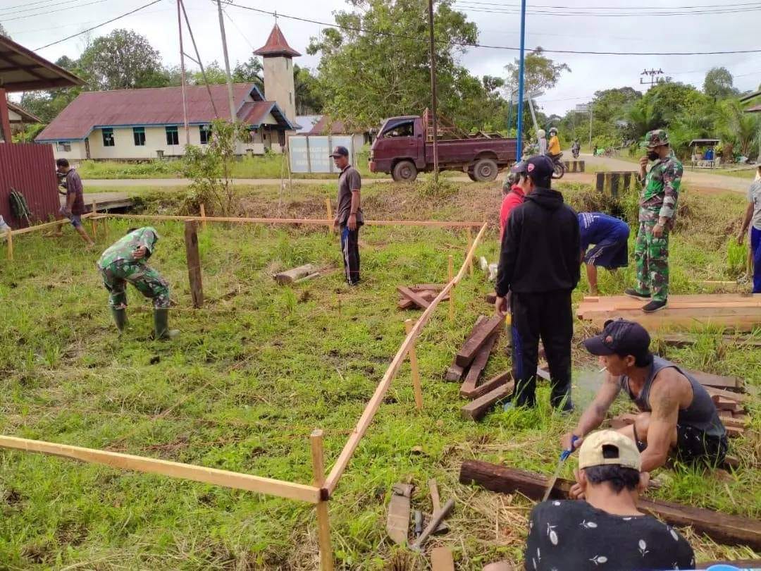 Kapuas Hulu – Babinsa Koramil 1206-12/Kalis Kopda Agie Amanda, Kopda Daniel, Kopda I Kadek bersama Babinkamtibmas serta masyarakat bergotong royong membangun pos Babinsa Di Desa Teluk Sindur, Kecamatan Bika, Kabupaten Kapuas Hulu. Sabu, (12/03/2022).