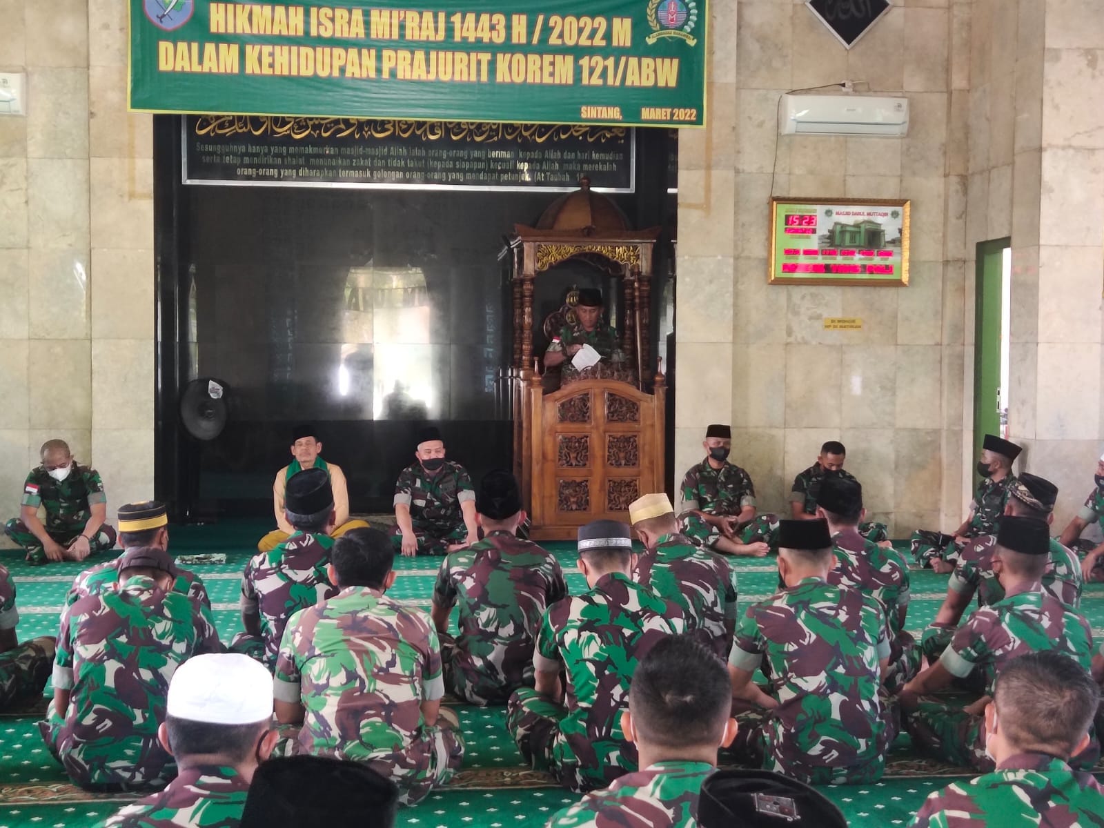 Peringatan Isra’ Mi’raj 1443 H/2022 M kali ini mengambil tema “Hikmah Isra’Miraj dalam kehidupan Prajurit Korem 121/Abw”.