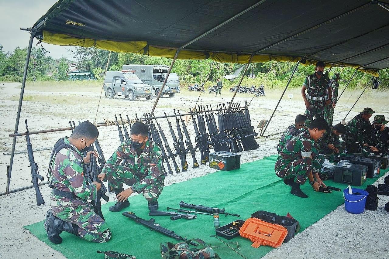 Sintang, Dalam memelihara dan meningkatkan kemahiran menembak Prajurit Korem 121/Abw melaksanakan latihan menembak senjata ringan pada program anggaran TW-1 tahun 2022 di lapangan tembak Batalyon Infanteri 642/Kps, kelurahan sengkuang, kecamatan Sintang, Kabupaten Sintang, Kalimantan Barat, Rabu (16/03/2022).