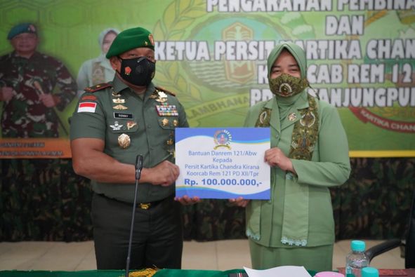 Bantuan tersebut berupa dana tunai dari Komandan Korem 121/Abw, Brigjen TNI Dr. Ronny, S.AP,.M.M yang diserahkan kepada Ibu Ketua Persit KCK Koorcab Rem 121 PD XII Tanjungpura Ibu Rissa Ronny. Kegiatan ini diikuti oleh anggota Persit jajaran Koorcab Rem 121 PD XII Tanjungpura.